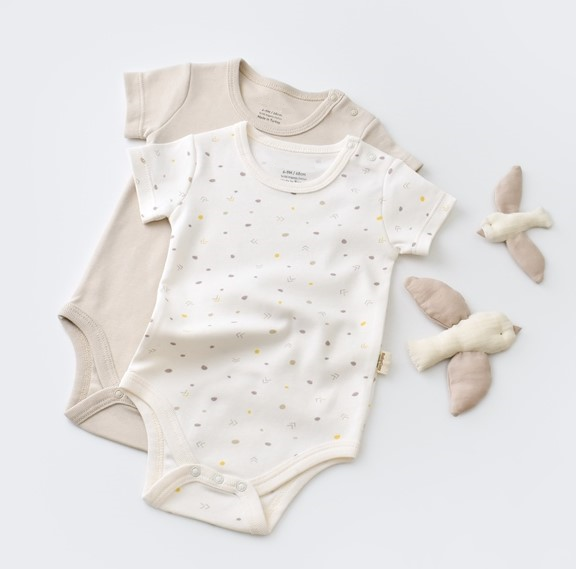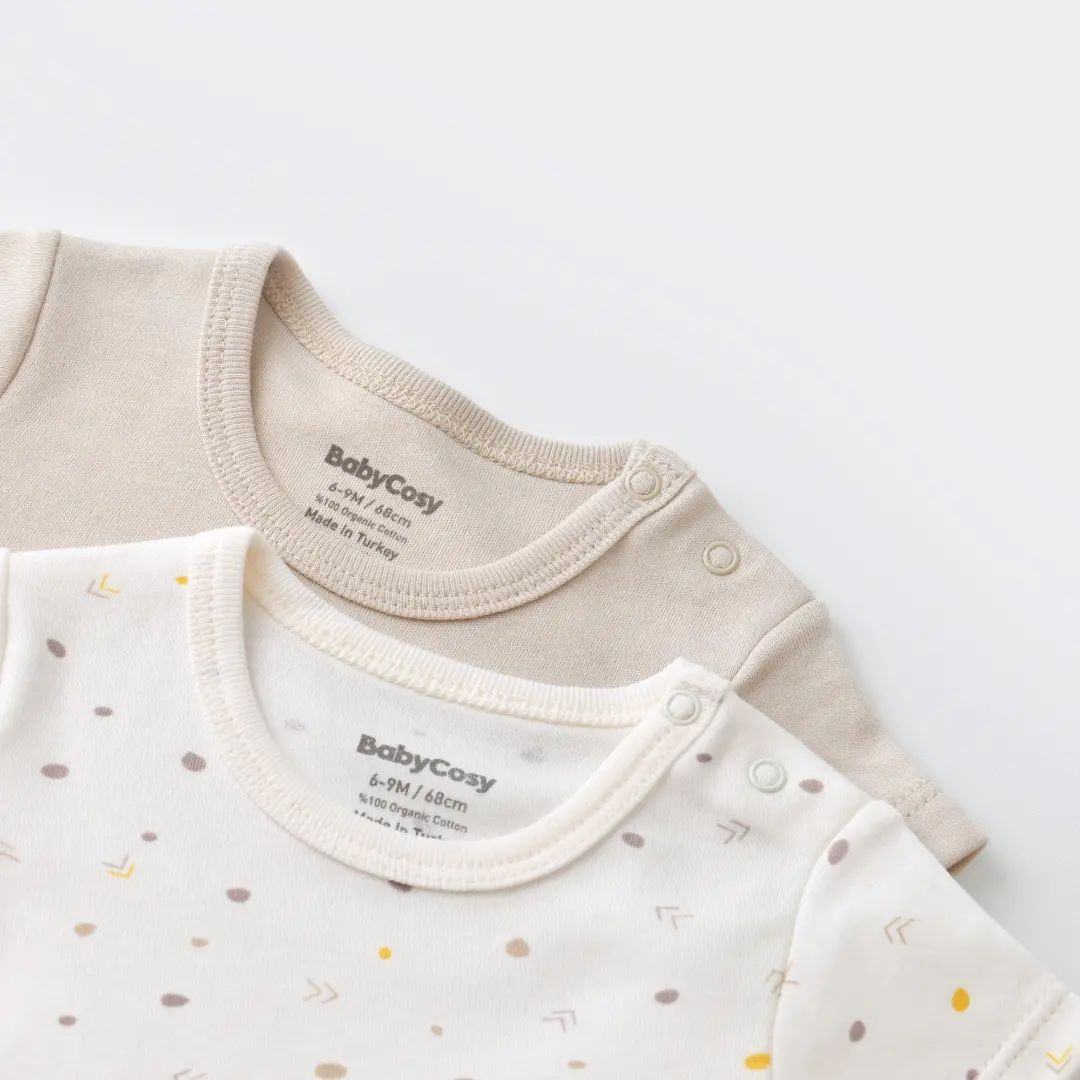 Gemaakt van 100% biologische katoen, is elke romper in deze set ongelooflijk zacht, ademend en zacht voor de gevoelige huid van je baby. De set bevat twee veelzijdige rompers – een in een rustgevende crèmekleur en de ander met een charmant wit patroon – ideaal voor het mixen en matchen.