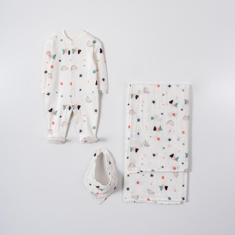 Welcome your newborn with the ultimate comfort and style of our 3 Piece Home Essential Set. Specially designed for babies aged 0-3 months (56 cm), this set is crafted from 100% organic cotton, ensuring your baby’s delicate skin is wrapped in softness and breathability.